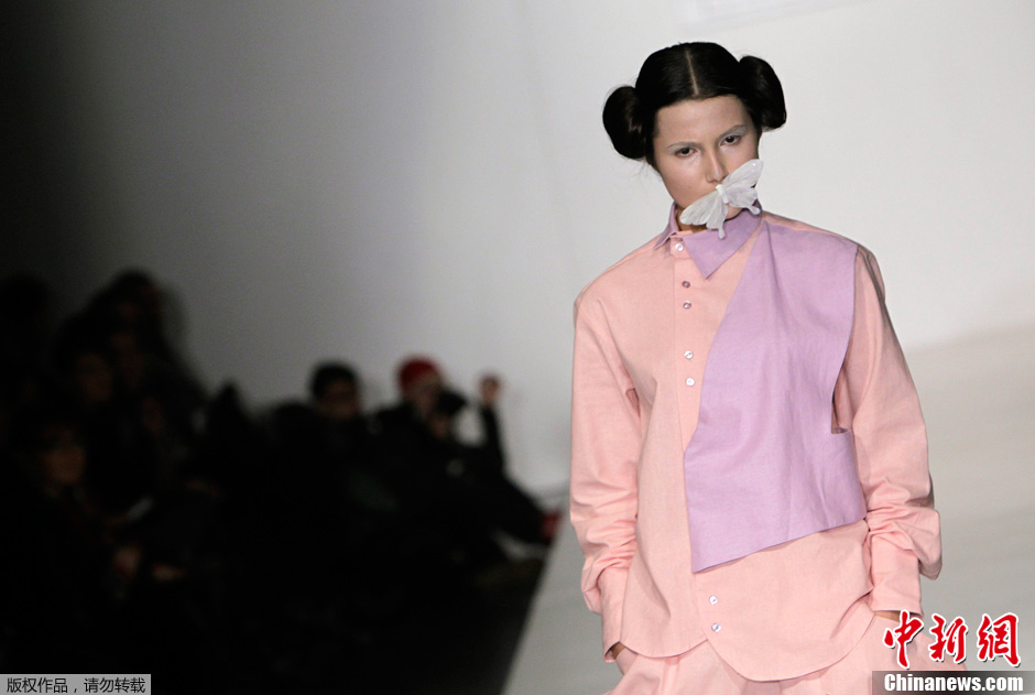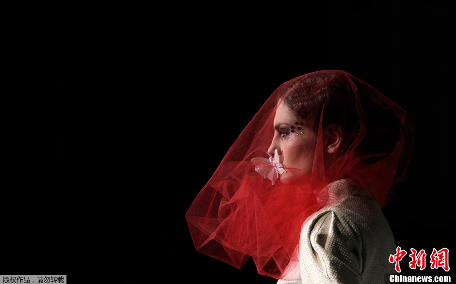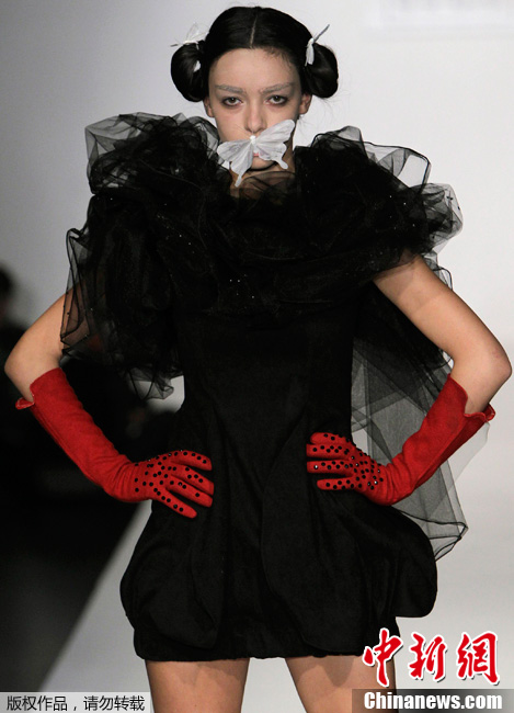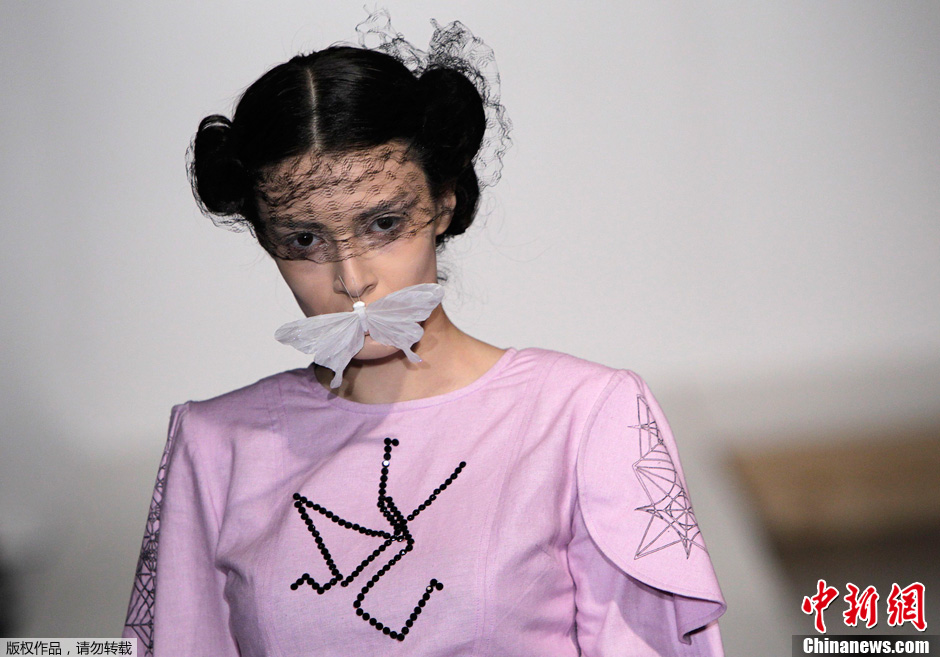 2011年11月27日,第比利斯時裝周上,模特展示格魯吉亞設計師的作品蝴蝶掩嘴造型奇特。