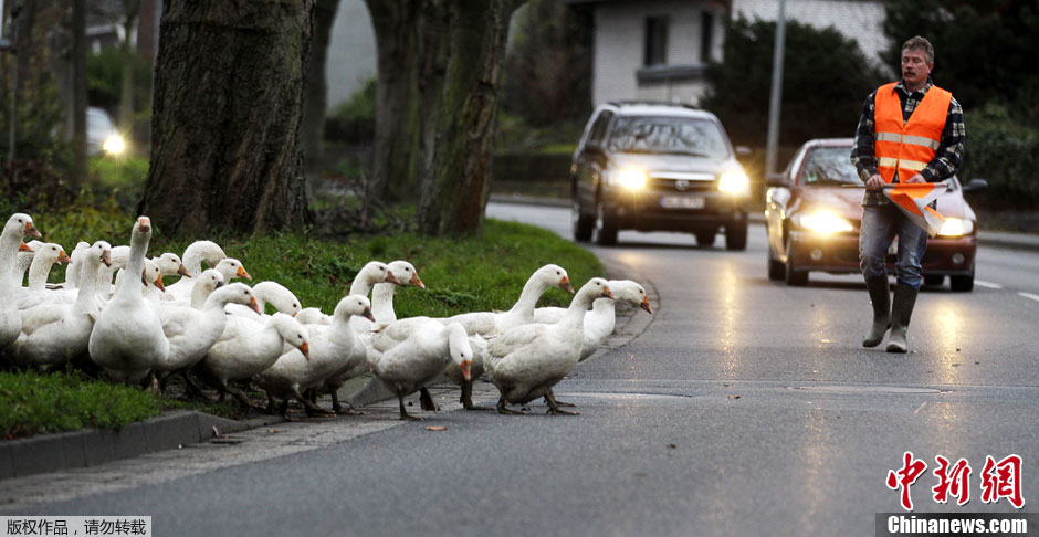 當?shù)貢r間12月8日,德國西部城市杜伊斯堡,一名農(nóng)民趕著他飼養(yǎng)的近150只鵝穿過馬路,其間,過路車輛小心避讓。