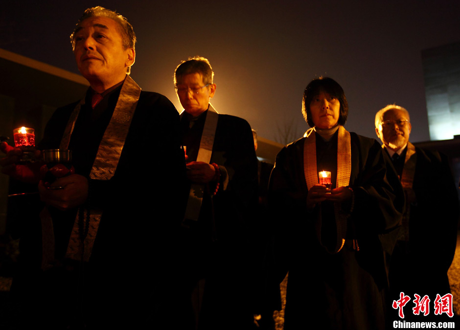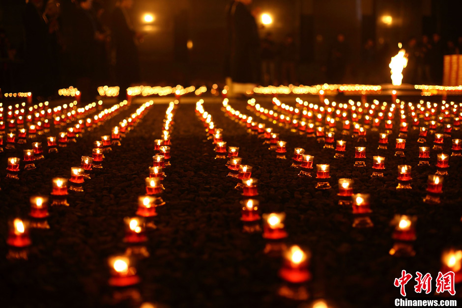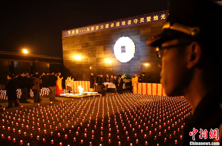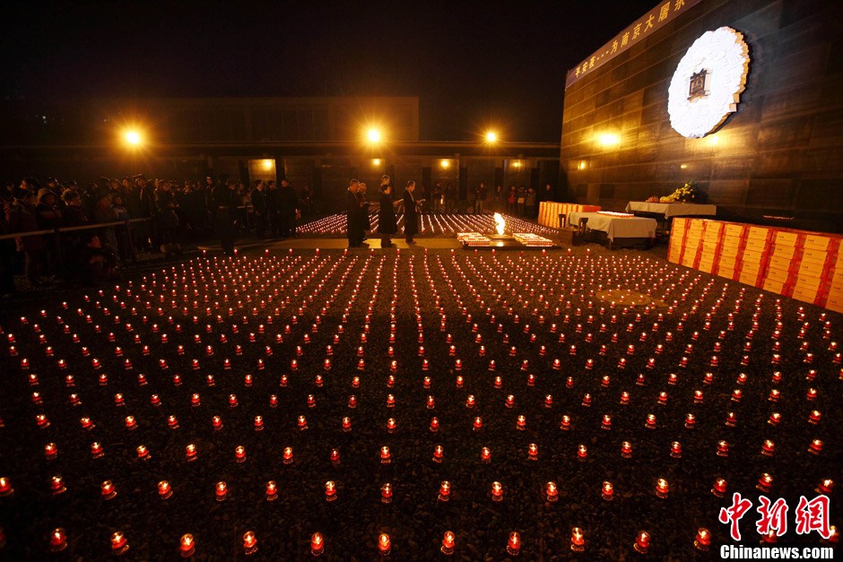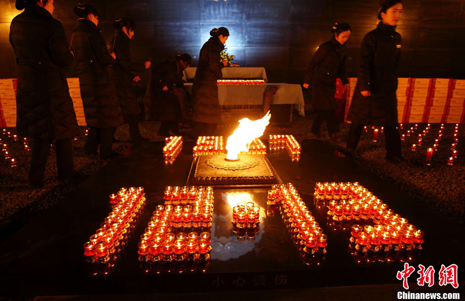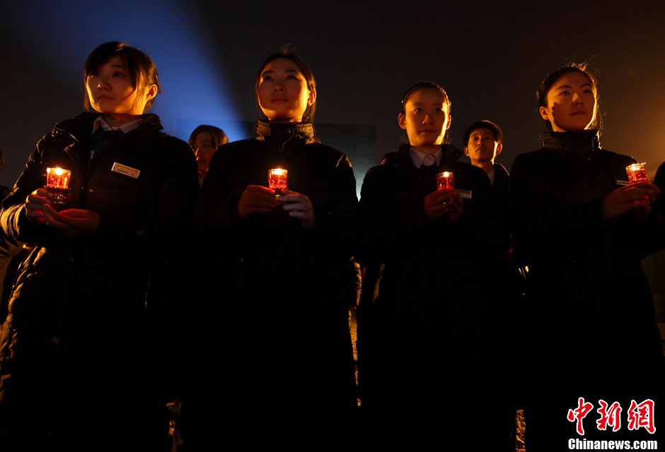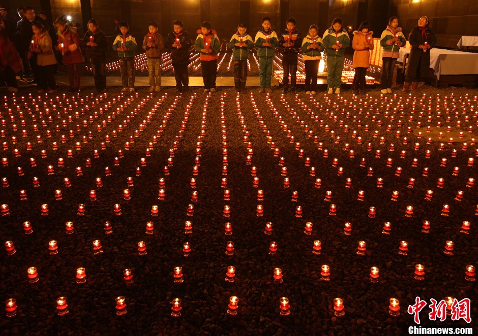 12月12日,小學生們正在擺放點燃的蠟燭。當日晚,在侵華日軍南京大屠殺遇難同胞紀念館內(nèi)祭場上,“平安夜——為南京大屠殺遇難者守靈暨燭光祈禱和平晚會”正在舉行,3000只紅燭在寒風中搖曳,來自韓國、日本等國際友好人士以及南京江東門小學的師生代表共為南京大屠殺遇難同胞秉燭守靈。中新社發(fā) 泱波 攝