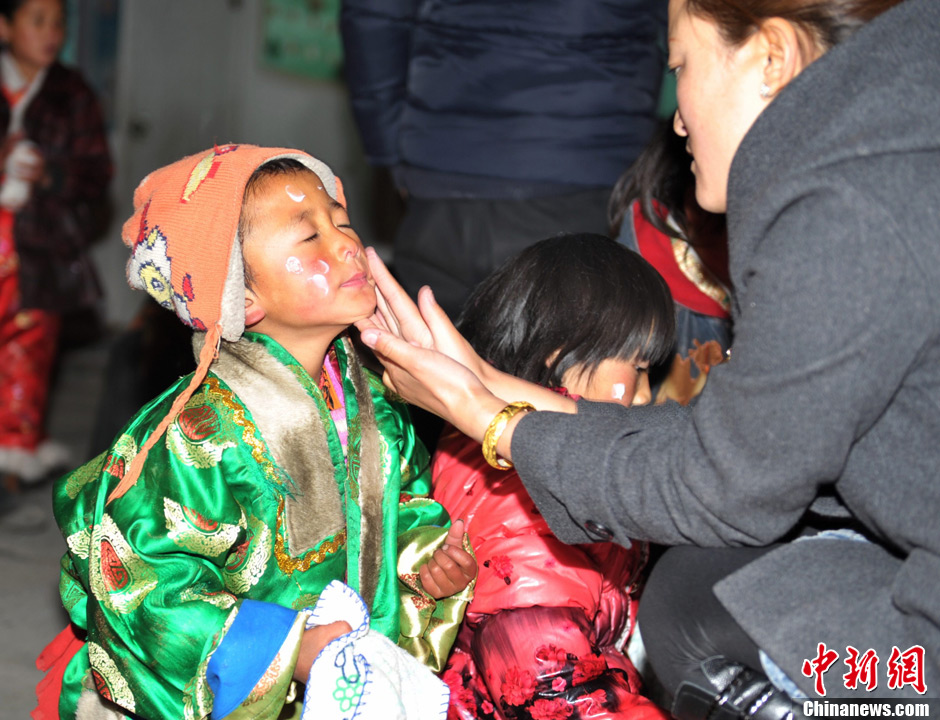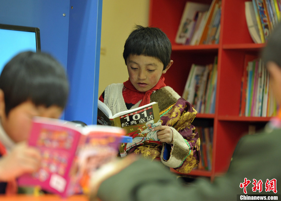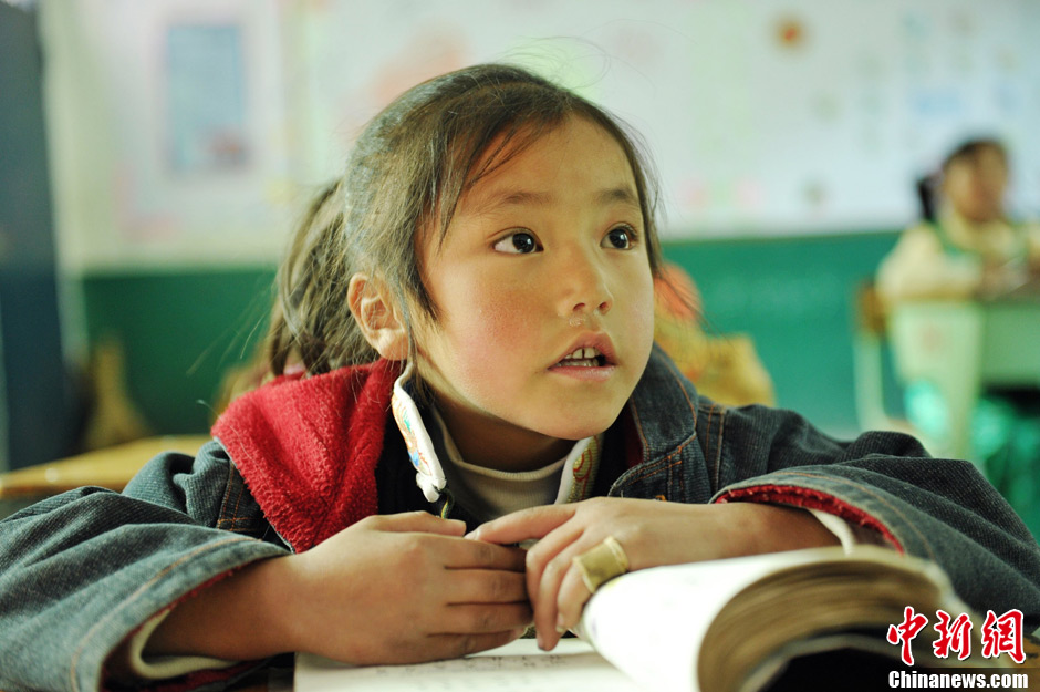 四川阿壩州馬爾康縣腳木足鄉中心小學距縣城41公里,海拔3000多米,成立于1954年,是一所全寄宿制小學,學校有136名學生和21名教職工,7個教學班。學校僅有一棟主教學樓,另外兩棟小樓是教師學生宿舍和食堂。該校老師既要完成繁重的教學任務,又要照顧好學生們吃和住等日常生活。圖為一年級一班正在上課的6歲女生德斯基。中新社發 劉忠俊 攝