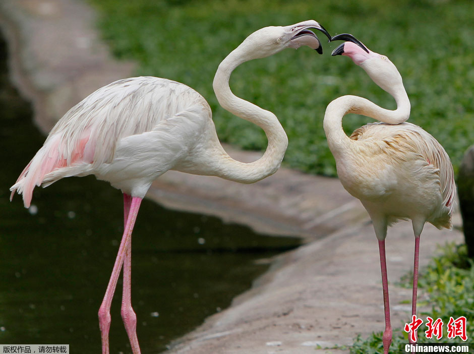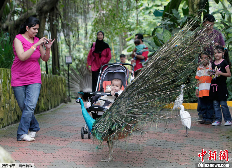 2011年12月5日,馬來西亞吉隆坡鳥園,一只印度藍孔雀飛過池塘。園內有200余品種共3000多只鳥,其中90%來自當地,10%來自海外。
