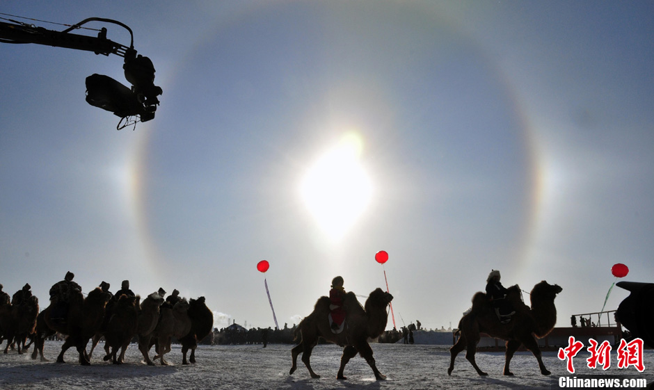 12月16日,內蒙古鄂溫克自治旗賽馬場天空出現日暈景觀,為當日開幕的第十二屆內蒙古•呼倫貝爾冰雪旅游節暨鄂溫克冬季那達慕增添了浪漫與傳奇色彩。中新社發 余昌軍 攝 圖片來源:CNSPHOTO
