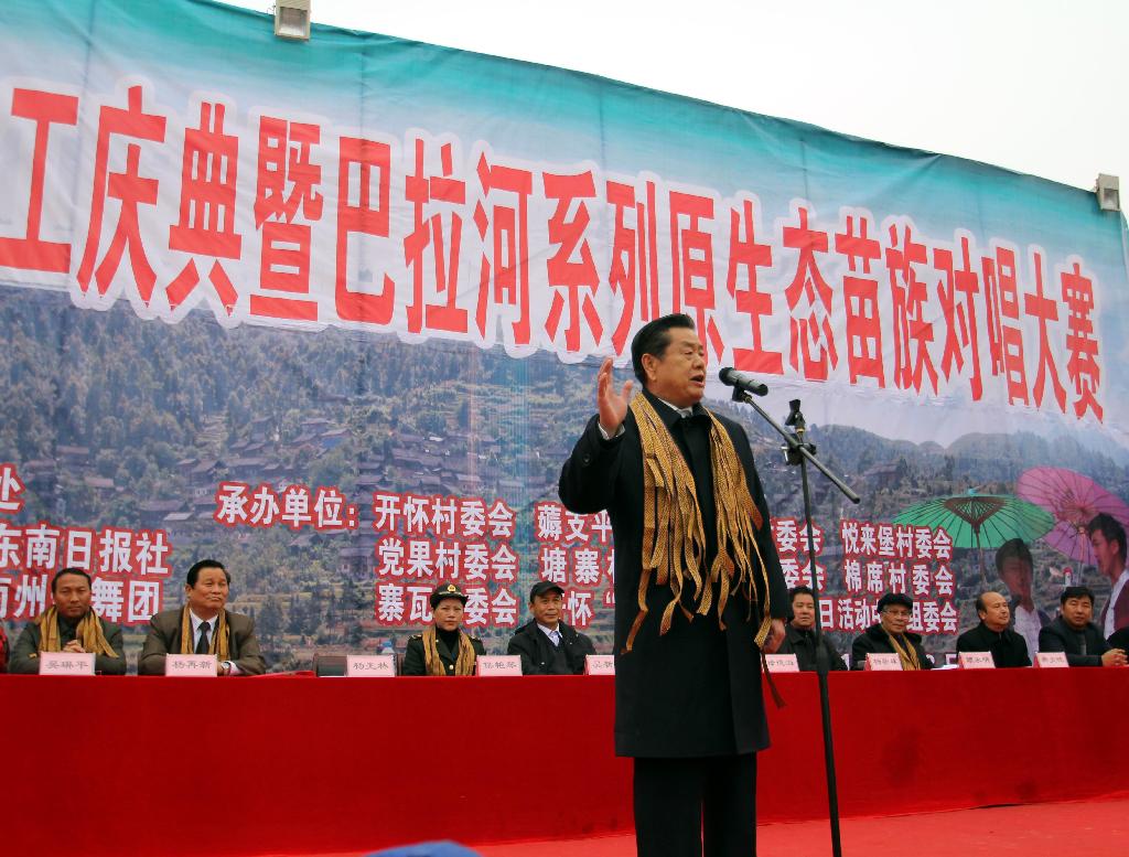 吳琳平代表凱里市委、市人民政府對開懷“碧檔嘎”苗族歌匯場的竣工表示熱烈祝賀。他指出,開懷“碧檔嘎”苗族歌匯場竣工并投入使用,是開懷街道經濟社會發展史上的一件大事,也是凱里市經濟社會發展中的一件大事,是深入貫徹落實黨的十七屆六中全會精神和省委十屆十二次全會精神,積極推進民族文化大發展、大繁榮的具體體現。這對挖掘和弘揚巴拉河系列原生態苗族文化,打造民歌品牌,加快推動旅游活市,快速推進城市化進程,振興民族經濟有著重要而深遠的歷史意義和現實意義,希望各承辦單位要充分發揮好、利用好開懷“碧檔嘎”苗族歌匯場,讓其更好的傳承好、發展好苗族傳統文化,使廣大群眾共享苗族傳統文化大發展、大繁榮成果,希望各位參賽選手在比賽中,充分展現出團結進取、蓬勃向上的精神風貌,大力發揚友誼第一、比賽第二的精神,賽出水平、賽出風格、賽出友誼、賽出團結的新氣象。