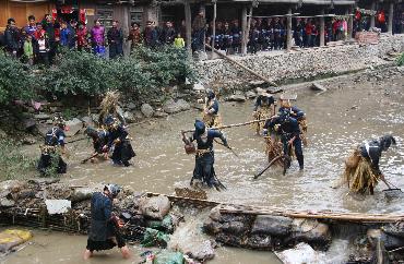 2月4日,在“抬官人”活動中,“野人”在河里捕魚。