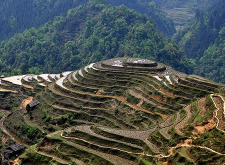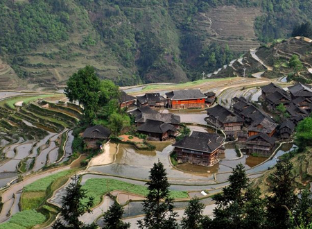 加榜梯田位于貴州省從江縣加榜鄉境內,地處月亮山腹地,距離縣城80公里。從黨扭村至加榜鄉所在地連綿25公里,一片連著一片,層層疊疊,雄偉壯麗,形狀各有千秋,如苗家姑娘編織的一條條彩帶,盤繞在崇山峻嶺中,最長的有近1千米,最短的用一頂斗笠都能蓋過。而那些散落在梯田中間獨具苗鄉特色的吊腳樓,好似五線譜中的一顆顆音符。