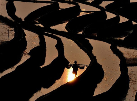 晨曦中的梯田上,當地人勤勞的身影沐浴萬丈霞光中。