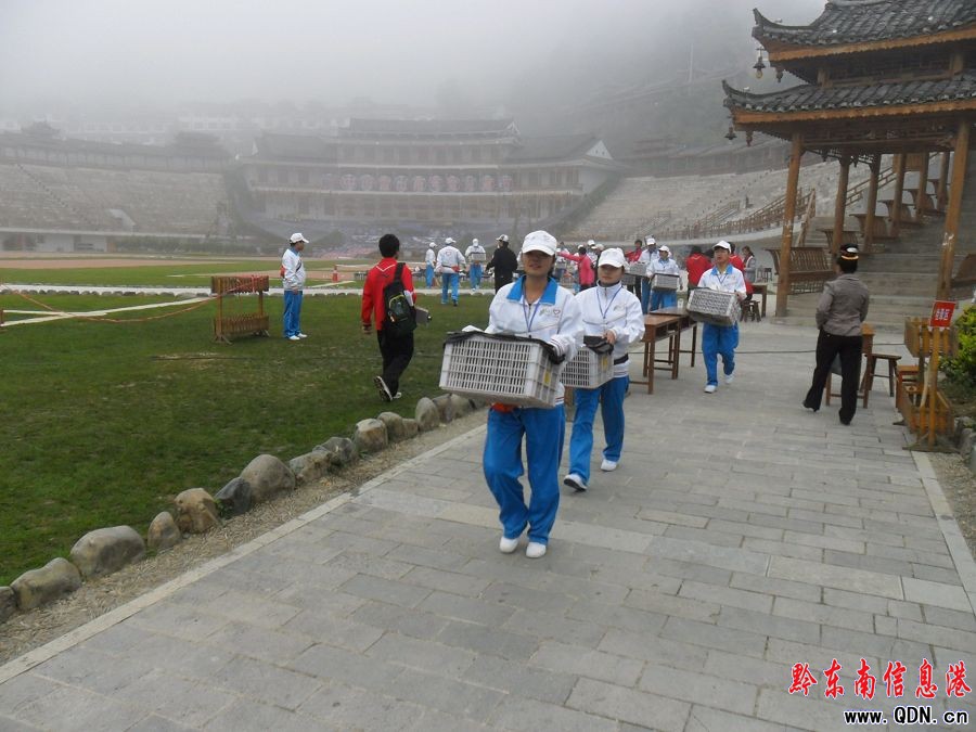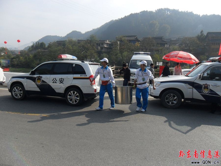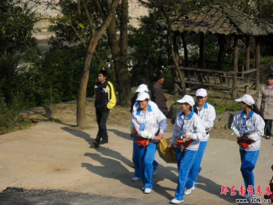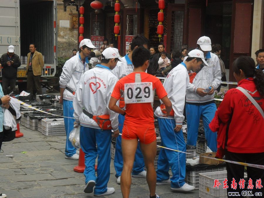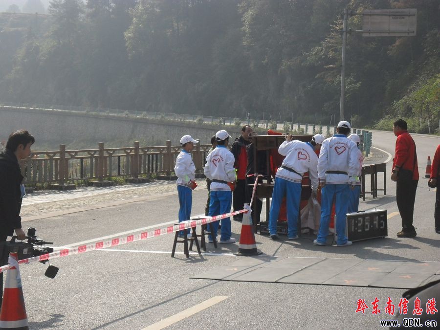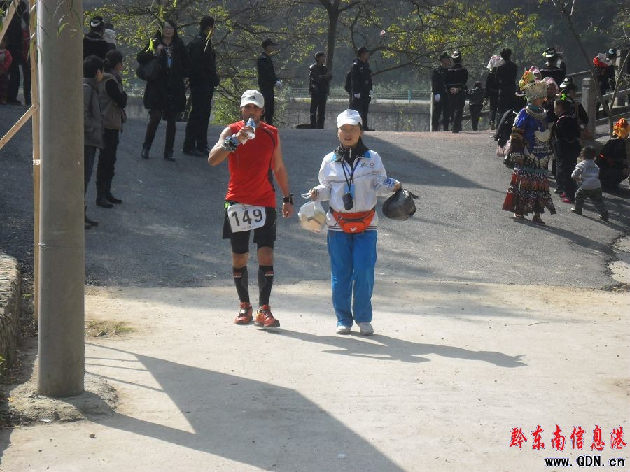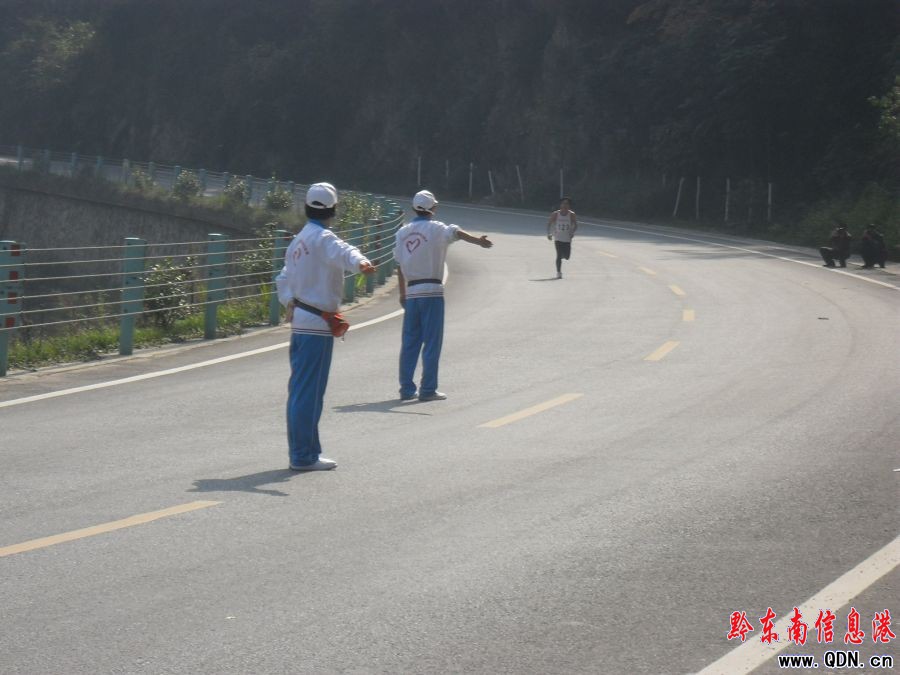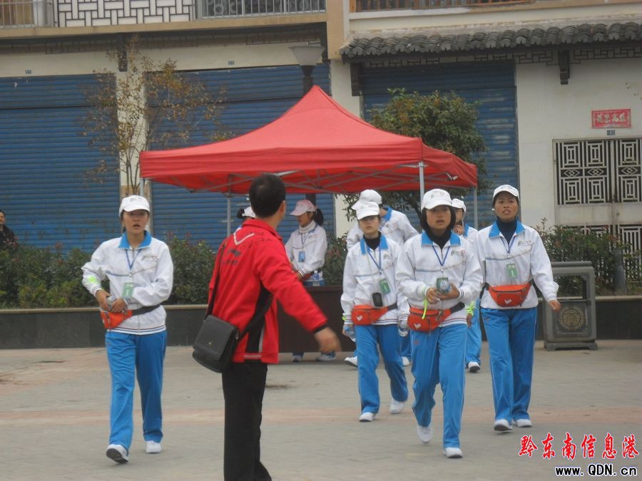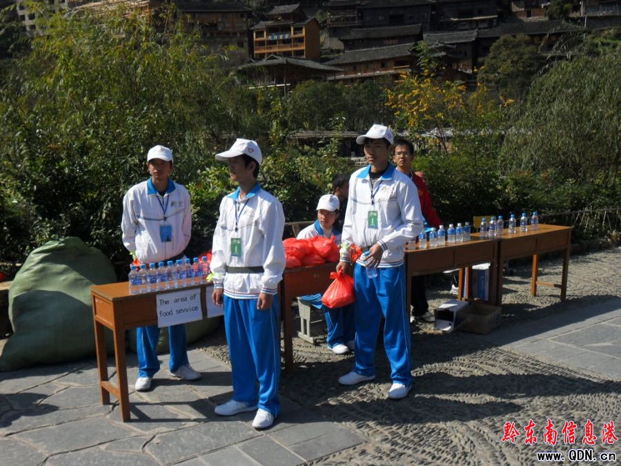 2011中國•貴州黔東南超100公里跑國際挑戰賽于2011年11月11日至13日在凱里、雷山、鎮遠舉行,圖為志愿者協助裁判工作的現場。