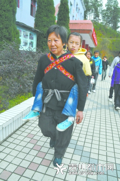 12月2日上午6時許,在黔東南州麻江縣賢昌鄉暫住的62歲的田如英早早起來,背起孫女劉琳往賢昌中學而去。賢昌中學劉延品副校長說,今年14歲的劉琳是學校八年級二班的學生,她患病不能走路,奶奶每天都背她上學,已持續了7年。