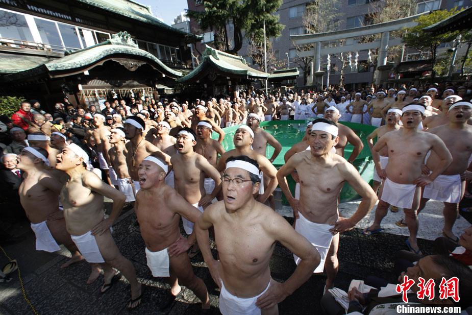 1月9日,日本東京,數十名的日本民眾在當地的一個寺廟中參加“冷水浴”。該寺廟每年都會舉行“冷水浴”會,祈禱身體健康。