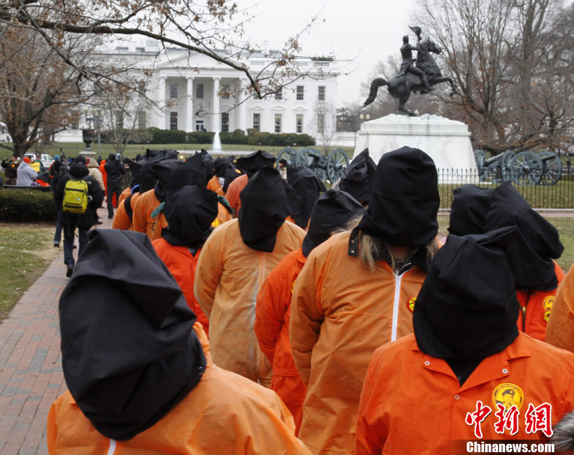 1月11日,美國華盛頓,示威者穿著橙色的囚服游行,要求關閉關塔那摩監(jiān)獄。當天是關塔那摩監(jiān)獄建立9周年紀念日。