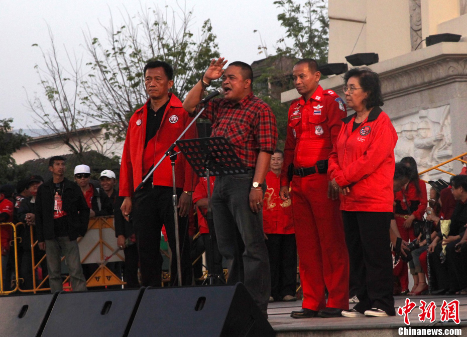 2月13日下午,泰“紅衫軍”支持者聚集在首都曼谷民主紀(jì)念碑集會示威,要求政府釋放其領(lǐng)導(dǎo)人及爭取社會公平正義。圖為紅衫軍集會現(xiàn)場。