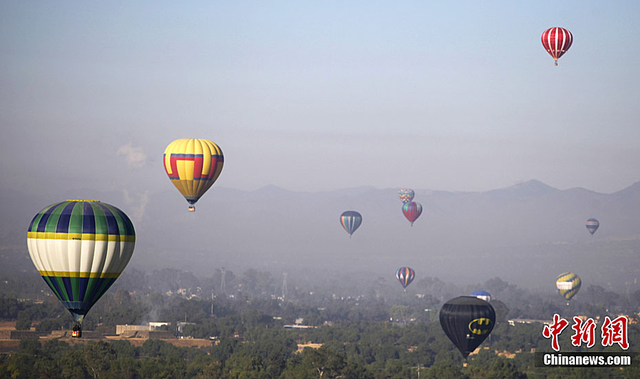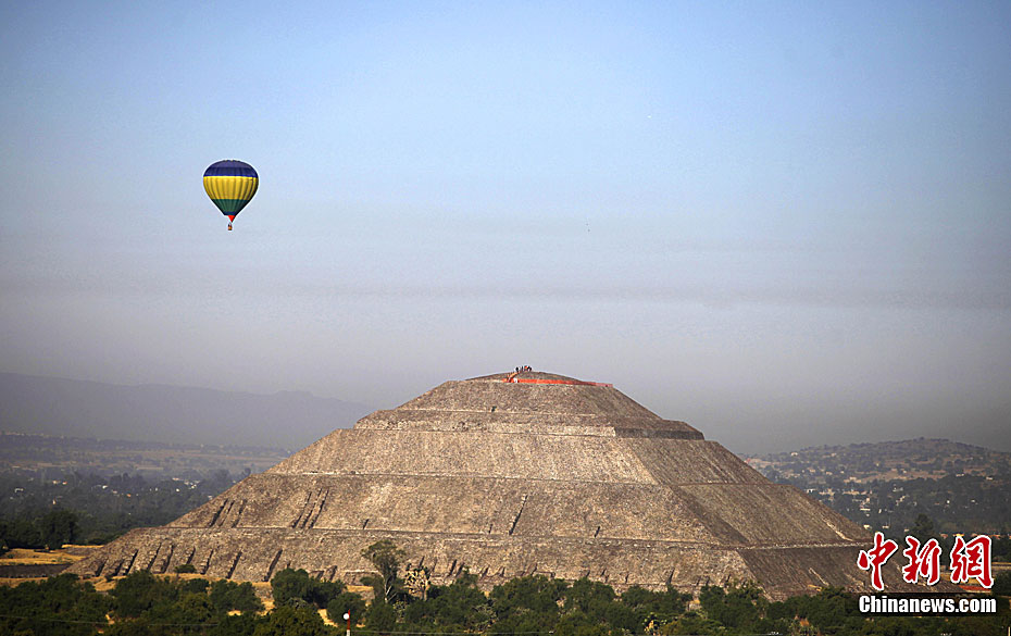 3月21日,熱氣球從位于墨西哥首都墨西哥城東北40公里的太陽金字塔上空飛過。墨西哥近日在特奧蒂瓦坎附近舉行熱氣球節迎接春分的到來。