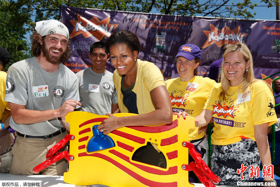 2011年6月15日,美國華盛頓特區,美國總統夫人米歇爾·奧巴馬與志愿者在一所公立小學協助修建操場。米歇爾心情大好,甚至蕩起了秋千。