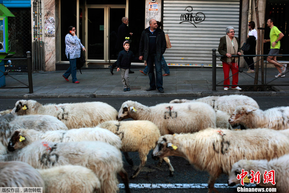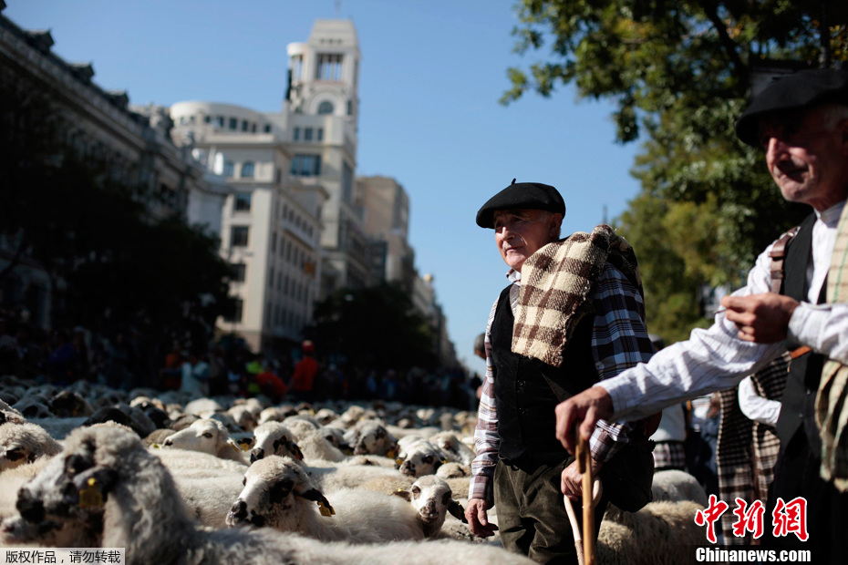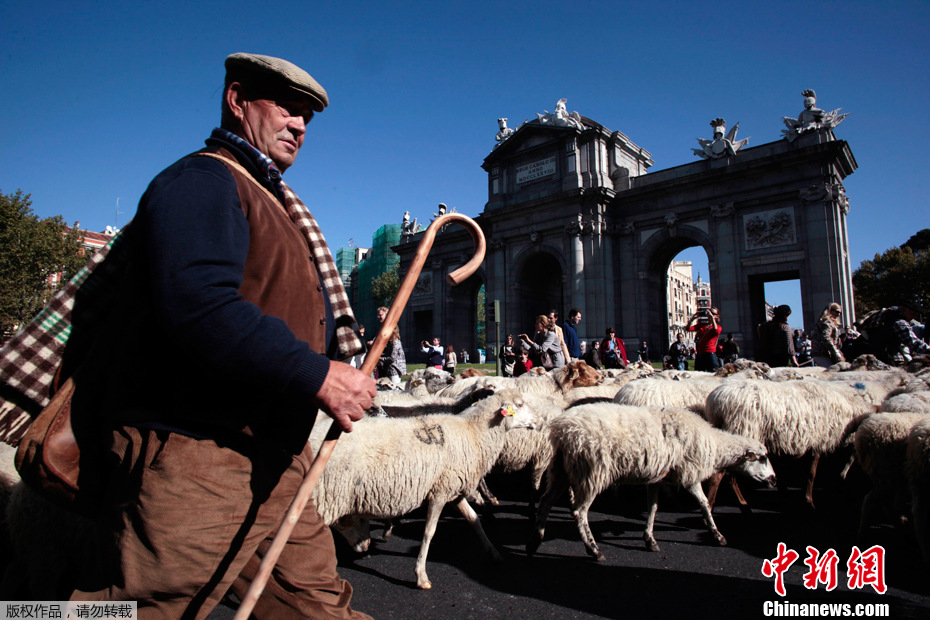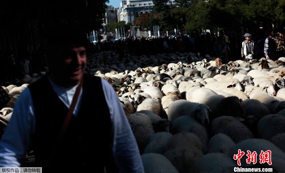 2011年10月30日,在西班牙馬德里市中心,成百上千頭綿羊被趕上街頭,以此項活動促進古老遷徙道路的保護工作。牲畜每年都會成群從寒冷地帶遷徙到水草肥美的牧場,這至今已經有800多年。
