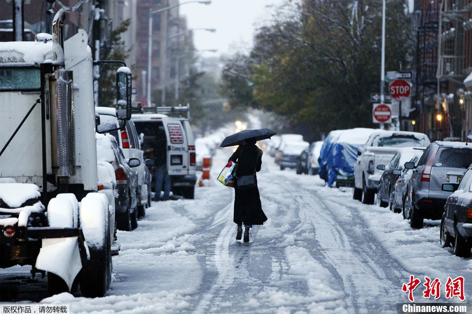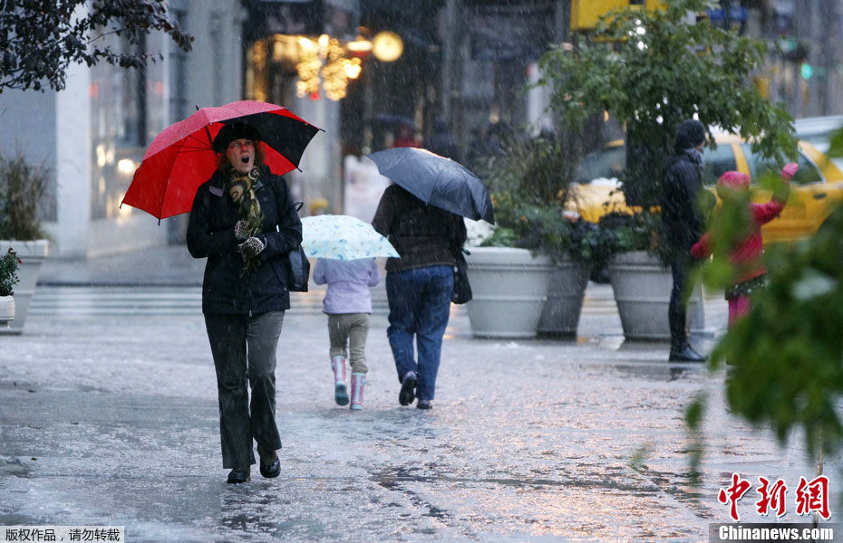 當地時間10月29日,美國東海岸遭遇罕見十月大雪。在紐約中央公園,人行道的積雪已經超過7厘米。罕見的提前降雪已致美國東海岸超過170萬人斷電,紐約州有超過20萬人斷電。圖為紐約街頭,一對母女在雪中行走。