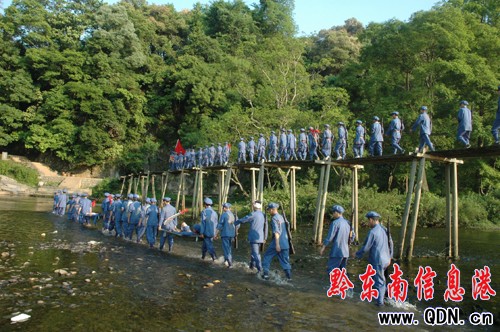 貴州革命老區(qū)黎平縣是中央紅軍長(zhǎng)征進(jìn)入貴州的第一站。在鮮花盛開(kāi)的紅五月,全縣掀起了紀(jì)念建黨90周年活動(dòng)的熱潮。圖為黎平縣國(guó)稅局與縣直機(jī)關(guān)黨員干部和民兵,著紅軍裝、走紅軍橋、唱紅軍歌的情形,讓侗鄉(xiāng)各族群眾永遠(yuǎn)跟黨走。(陸書(shū)明 周紅平 攝影報(bào)道)