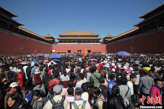10月3日,北京故宮端門前游人如潮。10月2日,故宮單日游客突破127800人。突破此前發布的“故宮今年十一黃金周期間每日游客人數固定在8萬人次”的規定。中新社發 陳曉根 攝