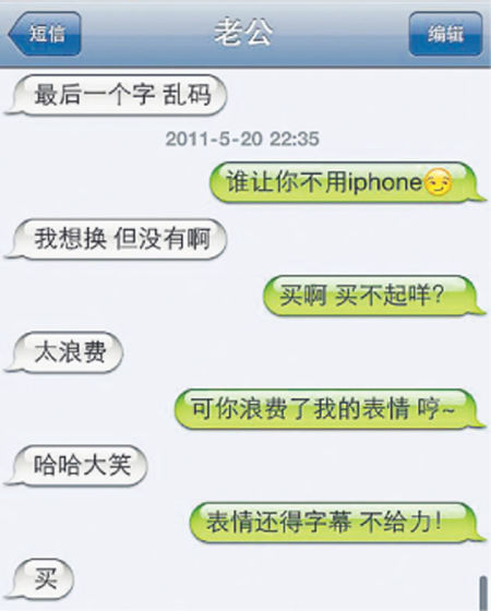 新浪娛樂(lè)訊 北京時(shí)間5月22日消息,據(jù)香港明報(bào)報(bào)道,王菲與老公李亞鵬在微博打情罵俏,王菲前晚(5月20日)在微博公開(kāi)與李亞鵬的短信內(nèi)容,她埋怨老公不用iPhone,看不到她發(fā)的圖案符號(hào)才誤指為亂碼,還質(zhì)問(wèn)他:“買(mǎi)不起嗎?”李亞鵬解釋是太浪費(fèi)時(shí),王菲不屑地說(shuō):“可你浪費(fèi)了我的表情,哼!”李亞鵬回應(yīng)“哈哈大笑”的文字,王菲還指摘:“表情還得給字幕,不給力!”李亞鵬最后屈服地說(shuō):“買(mǎi)。”趙薇取笑王菲將李亞鵬的喜劇感開(kāi)發(fā)出來(lái),拓闊戲路,等著看他們夫婦合演喜劇。
