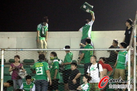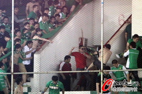 騰訊體育訊 2011年6月11日,2011年中超聯賽第10輪,河南建業1-1北京國安,兩隊球迷看臺發生沖突。 從圖片中可以清晰看到,河南球迷與國安球迷發生群毆,雙方使用了木棍、球場看臺座椅等器械互相攻擊,并且有國安球迷赤裸上陣,飛踹河南球迷。