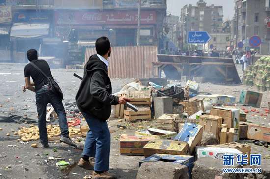 5月2日,示威者在埃及首都開羅投擲石塊。當天凌晨發生在國防部前的示威沖突目前已造成9人死亡、數十人受傷。為控制局勢,埃及軍方下午在國防部周圍部署了數百名士兵和警察,并在四周重要建筑物前設置崗哨,以防沖突再次發生。