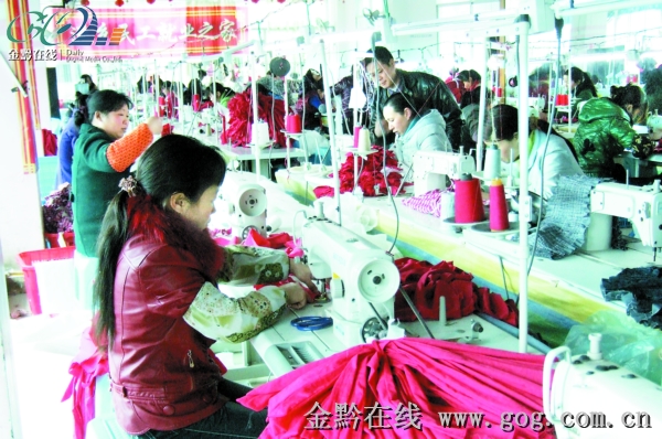 圖為在印江鑫利制衣有限公司就業(yè)的當(dāng)?shù)毓と嗽谮s制衣服。