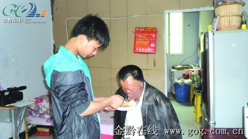 金黔在線訊 父親外出打工時遭遇不幸,全身燒傷面積為95%,母親悄悄離家出走。兩年來,畢節八中七年級(13)班學生申衛東用他那稚嫩的身體艱難地撐起一個家。他不僅要上學,還要照顧生活無法自理的父親。