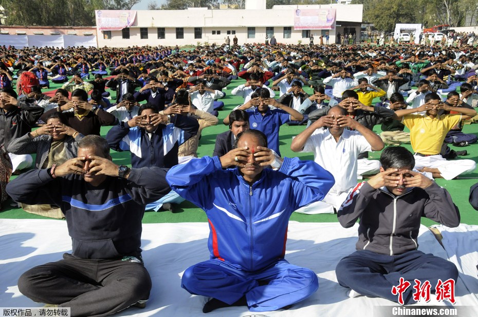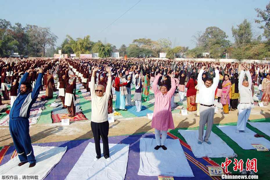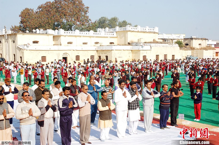 當地時間2012年1月12日,印度Bhopal,學生參加瑜伽練習。當天,160萬印度民眾集體做瑜伽,欲創造最大規模集體健身吉尼斯紀錄。