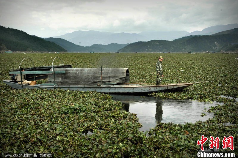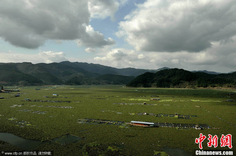 1月31日,福建寧德市古田縣水口鎮灣口村段,浩浩蕩蕩的水葫蘆延綿閩江近10公里,如同草原。2011年,該鎮400多養殖戶的網箱遭遇大面積死亡現象損失上億元,今年養殖區又遭水葫蘆圍困魚苗都無法放養。柳濤 攝 圖片來源:CFP視覺中國