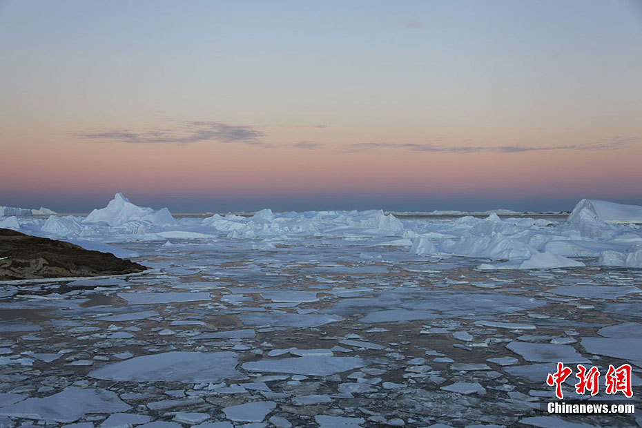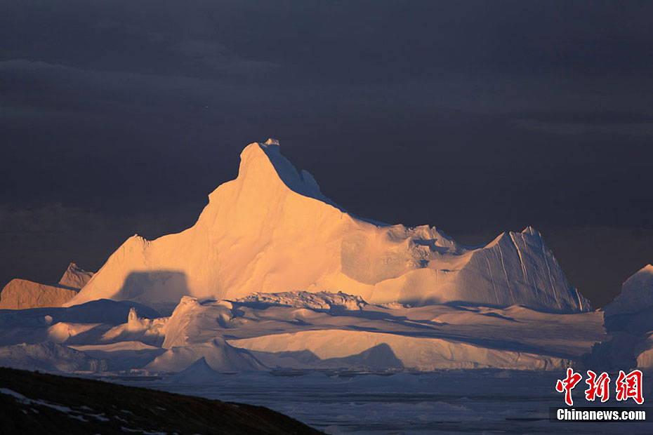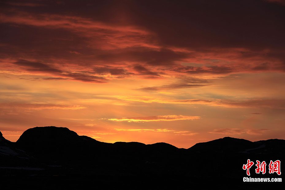 位于東南極拉斯曼丘陵地帶的中國南極中山站,由于地處南緯69°22’,從2011年11月23日開始,開始出現一年一度的極晝,一天24小時太陽都處于地平線以上,只要天氣晴朗,即使是子夜時分,仍能看到太陽。2012年1月21日,持續了60天極晝結束后,日落的時間越來越早,日出的時間越來越晚。圖為日落前在冰山頂上灑下的余暉。記者 阮煜琳 攝