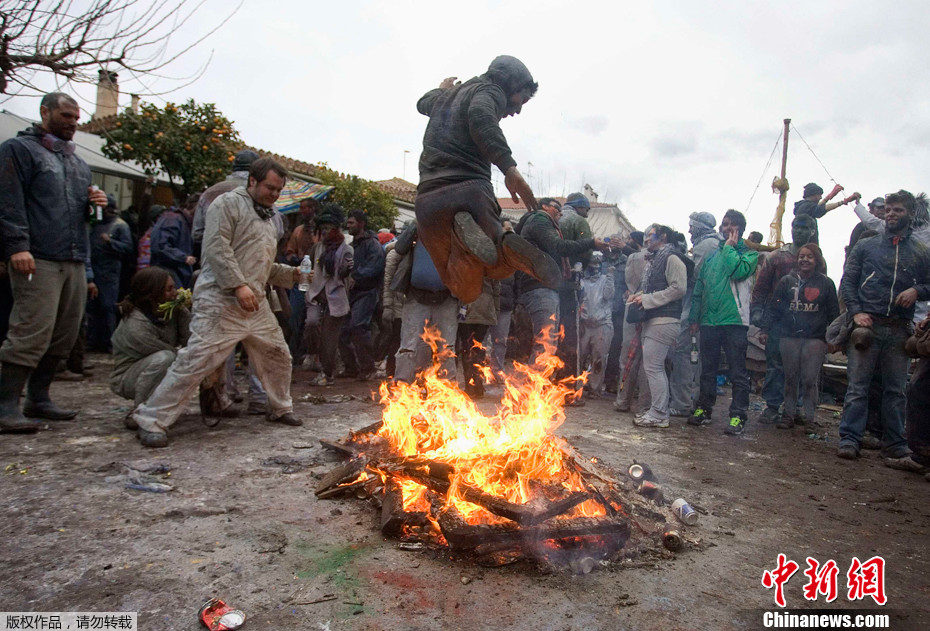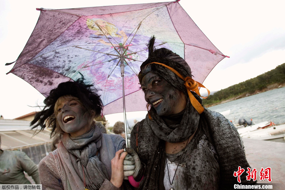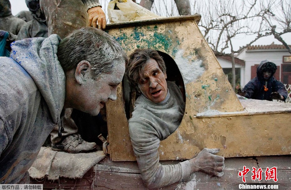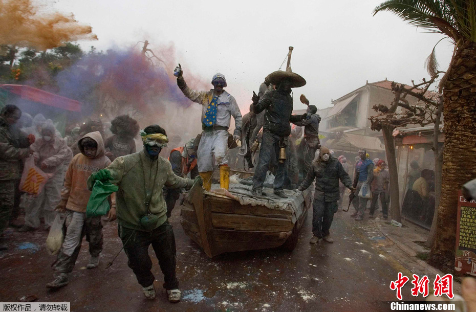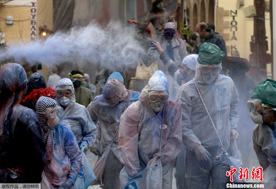 2月27日,希臘港口加拉西迪,狂歡者在街頭參加“面粉大戰”。“面粉大戰”是當地慶�?駳g季結束的一項傳統活動,隨后將是為期40天的齋戒月直至復活節。
