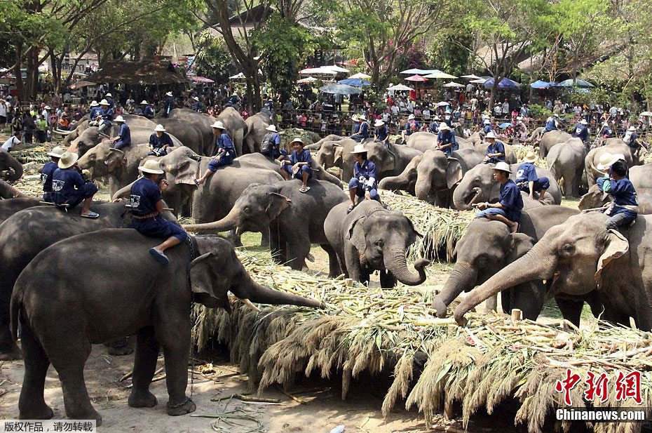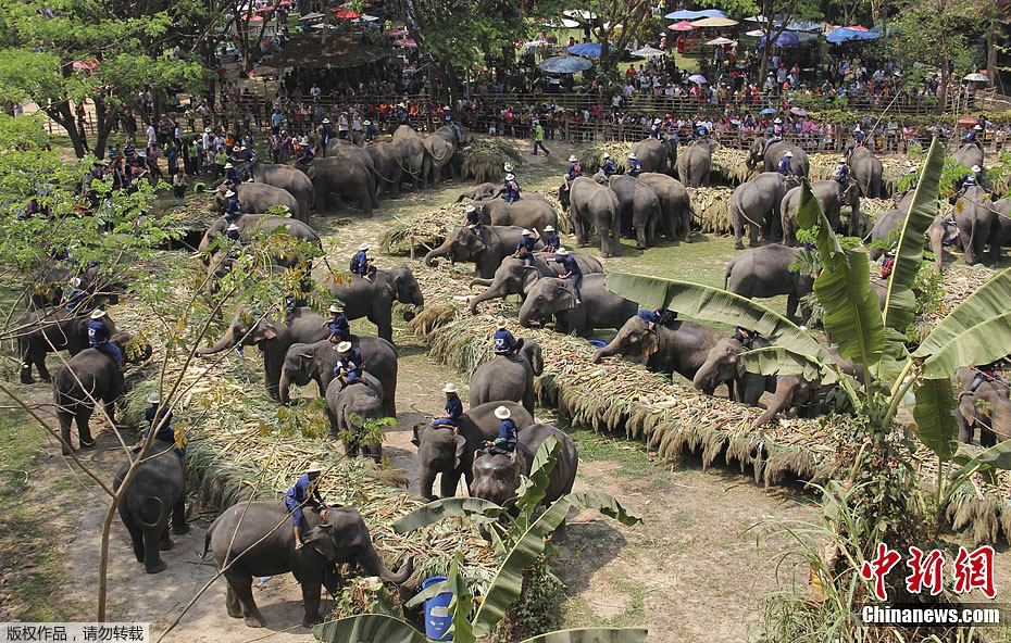 3月13日,泰國清邁,大象在食用水果和其他食物。這是一年一度的泰國大象日,約70頭大象在今天享用大型自助餐來慶祝節日,這個節日的目的是為了提高公眾保護大象和大象棲息處的意識,因為最近對大象的數據調查顯示泰國大象的數量已經降到了5000頭以下了。圖片來源:CFP視覺中國