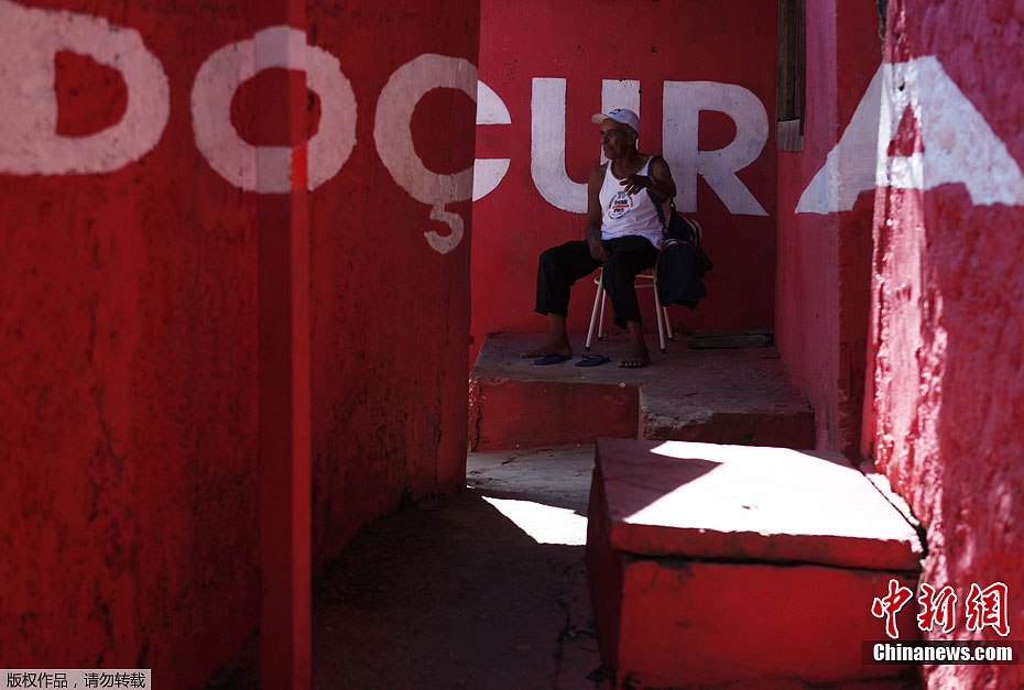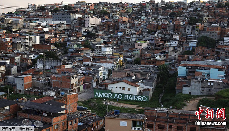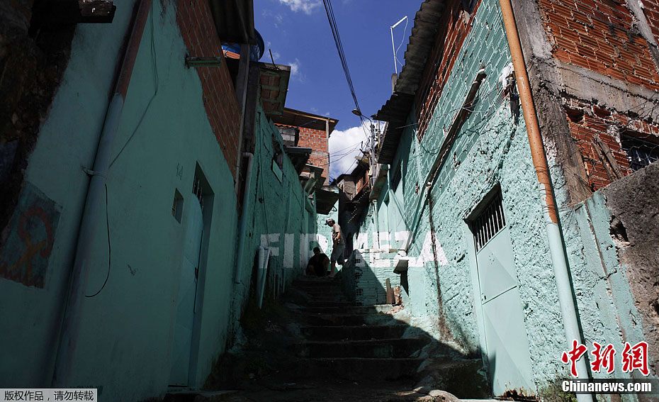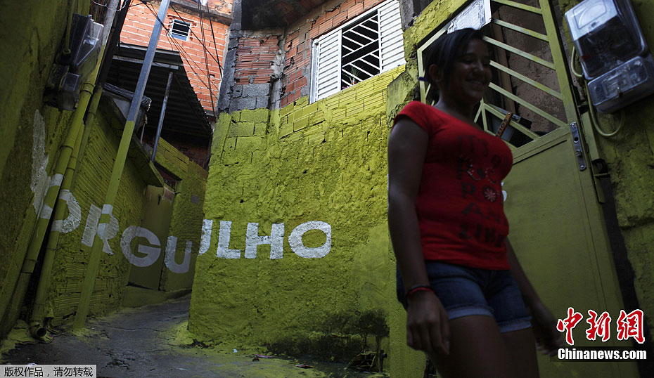 3月6日,巴西圣保羅,Brasilandia街區(qū)的一條街道上,彩色的墻上涂寫(xiě)的各種巨大白色葡萄牙語(yǔ)單詞。彩色墻壁和字母涂鴉是5位西班牙藝術(shù)家的“街道之光”藝術(shù)項(xiàng)目的一部分,它是在圣保羅Brasilandia貧民區(qū)居民的幫助下實(shí)現(xiàn)的。