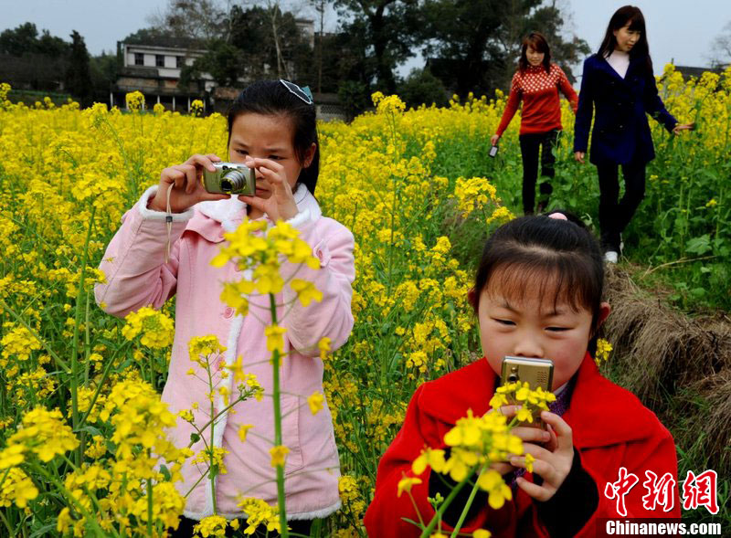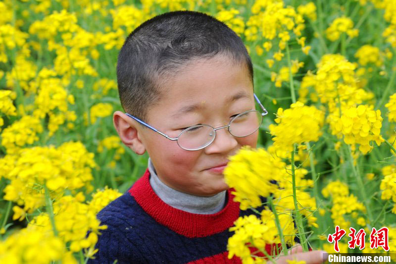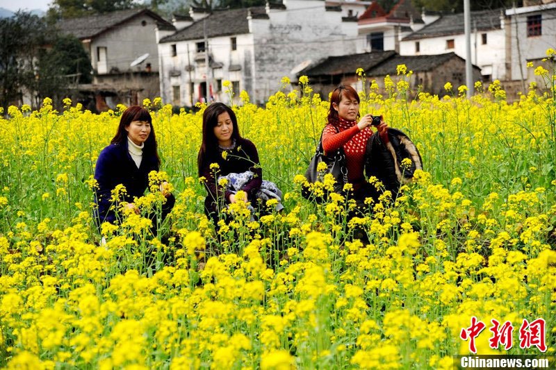 3月17日,江西省婺源縣,金燦燦的油菜映襯著一張張愜意的笑臉。圖片來源:東方IC