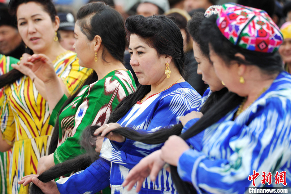 3月20日,來自麥蓋提縣十個鄉鎮的維吾爾族農民在文化廣場參加刀郎長辮子姑娘模特賽。各參賽隊姑娘們把長發展示與維吾爾族刀郎舞蹈結合在一起,一邊展示一邊舞蹈,歡度維吾爾族諾魯茲節的到來。中新社發 金煒 攝 圖片來源:CNSPHOTO