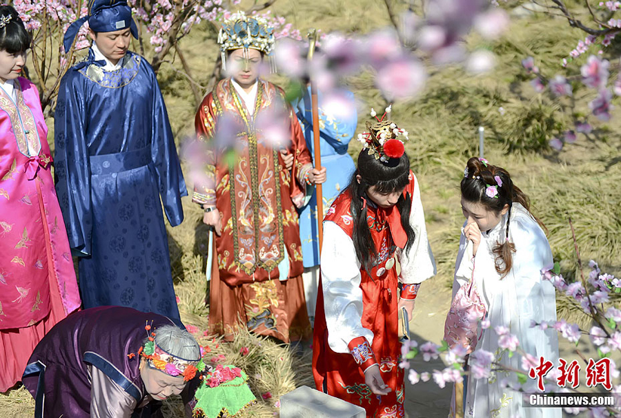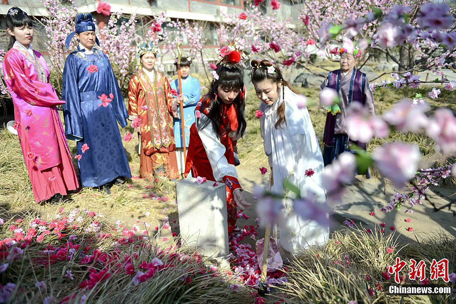 3月27日,北京大觀園對清明節期間“文化踏青 文明祭掃”的特色活動進行了彩排,再現“黛玉葬花”的經典篇章。據大觀園管委會主任馬俊潼介紹,結合清明民俗,挖掘紅樓文化,大觀園推出了獨具特色的文化活動。圖為伴著隨風飄落的花瓣,一曲《葬花吟》在花冢前響起。肩上擔著花鋤,鋤上掛著花囊,手內拿著花帚的黛玉,在寶玉的陪伴下,把花瓣葬在了花冢下。中新社發