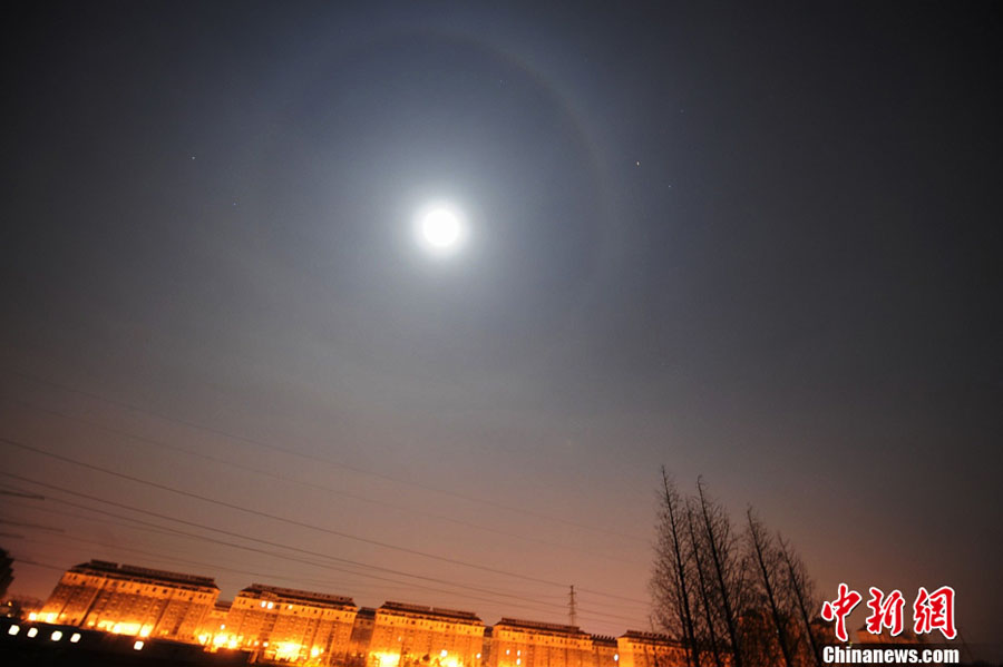 4月5日晚23時(shí)許,江蘇揚(yáng)州市區(qū)上空出現(xiàn)罕見的“月暈”現(xiàn)象,一個(gè)若隱若現(xiàn)的、大大的圓環(huán)罩在月亮周圍,甚為壯觀,整個(gè)過程持續(xù)1個(gè)多小時(shí)左右,據(jù)悉,月暈是月光經(jīng)高空中的冰晶折射而形成的暈。中新社發(fā) 孟德龍 攝 圖片來源:CNSPHOTO