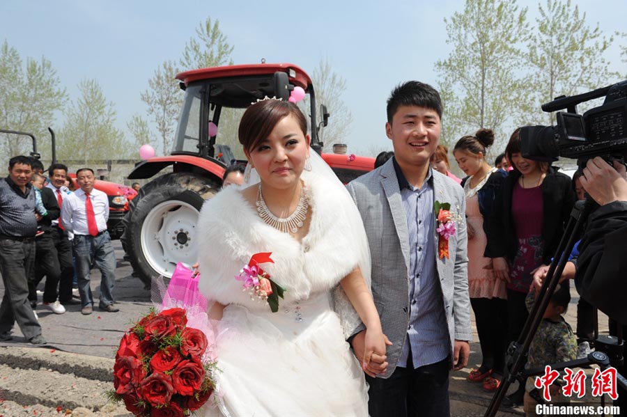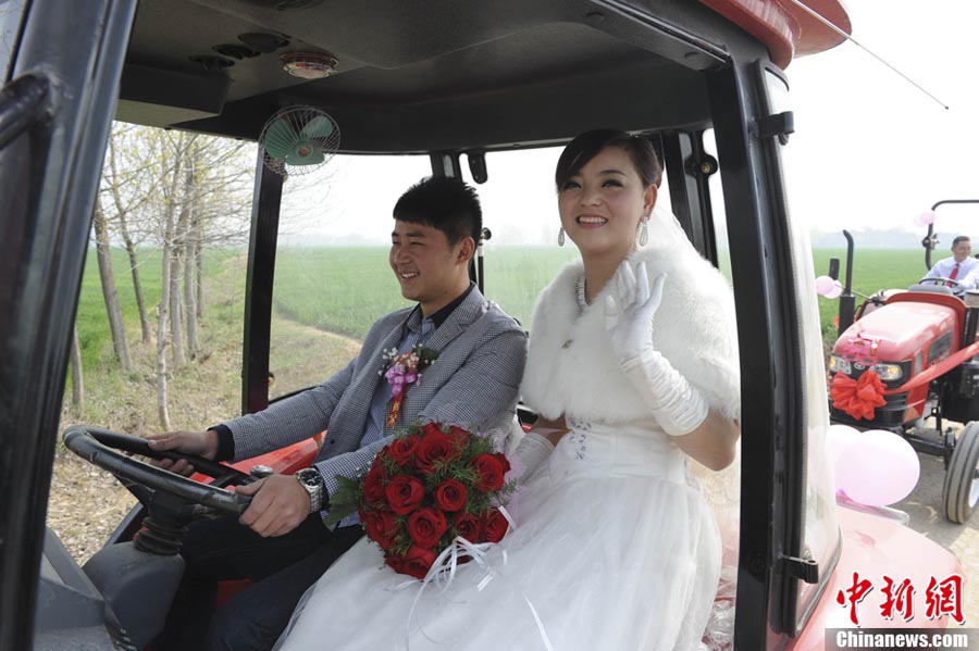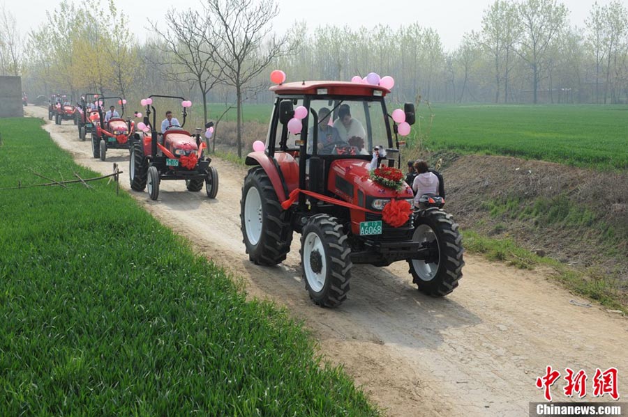 2012年4月6日上午,安徽省阜陽市潁泉區(qū)一青年農(nóng)民駕駛大紅拖拉機(jī)迎娶新娘。在當(dāng)日的迎娶隊(duì)伍中,新郎親自駕駛拖拉機(jī)引領(lǐng)車隊(duì)前行,場面頗為壯觀。中新社發(fā) 王彪 攝 圖片來源:CNSPHOTO