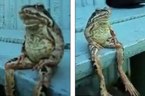 視頻中,一只酷似布偶“柯密特”(Kermit)的綠色青蛙“泰然自若”地“坐”在一條長(zhǎng)板凳上。有意思的是,這只青蛙像人一樣依靠大腿的力量端坐著,并且也似乎學(xué)人類(lèi)一樣呼吸。