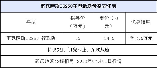 中新網訊 近日,從武漢地區雷克薩斯經銷商處了解到,為感謝客戶的信任與厚愛,特此推出暑期感恩回饋活動,豪華運動型轎跑車IS250特供5臺,現金直降4.5萬元,訂完即止,預購從速。詳情如下表:雷克薩斯IS250車型最新價格變化表