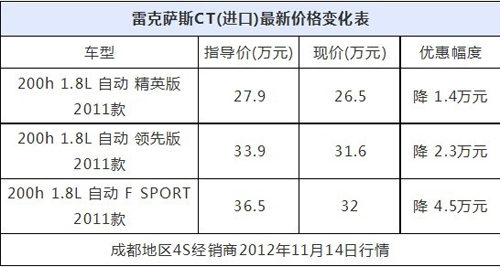 今日,筆者走訪了成都地區(qū)雷克薩斯4S店了解到,近期成都目前雷克薩斯CT200h全系最高現(xiàn)金優(yōu)惠4.5萬元,目前有少量現(xiàn)車,有意向的朋友可到店詳詢,更有機(jī)會獲得更多現(xiàn)金方面的優(yōu)惠。