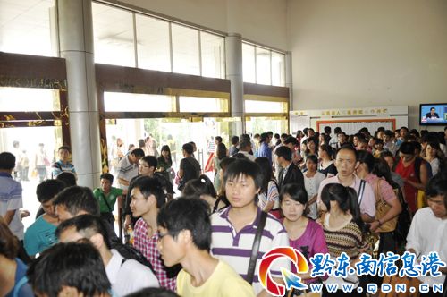 5月11日,在岑鞏縣政府大樓一樓大廳,工作人員正忙著給前來參加岑鞏縣今年事業單位公開招考的考生發放準考證,5月12日,考生將參加筆試。來自河北、河南、湖北、湖南、甘肅等近10省市,和貴州省貴陽、遵義、畢節、安順、興義、銅仁和黔東南等9個地州市逾5千名考生把大廳內外擠得嚴嚴實實。