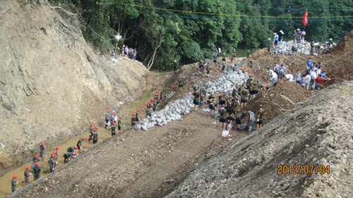 由于滑坡土石方造成了新龍組所住寨子坡底禾山溪形成了堰塞湖,滑坡體長度約400米,其中堰塞體高約25米,底部約100米,頂部約60米,平均厚度約80米。堰塞湖形成后,經(jīng)過武警官兵、民兵應(yīng)急分隊、施工隊伍和黨員干部共同努力,7月4日下午6時已全面貫通排水,排除了堰塞湖險情。截止7月5日8時,堰塞湖當(dāng)前庫容量為6.8萬立方米,上游來水量為0.1立方米/秒,渠道排水量為0.5立方米/秒。