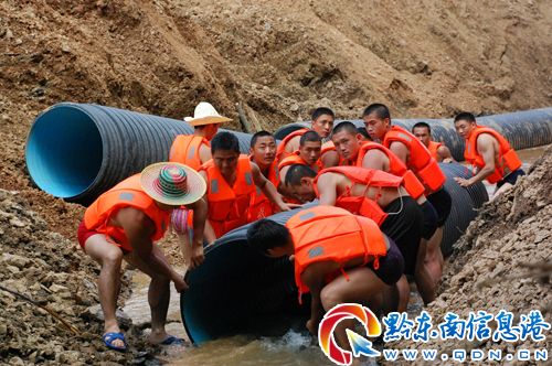 武警官兵冒險鋪設泄洪管 翁錫山攝
