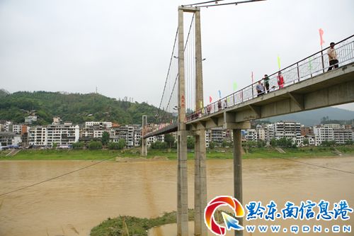 據悉,該橋橫跨城中都柳江,為純人行鐵索橋,全長310米、寬2.5米、高46米,總投資540萬元。該橋于2009年12月動工修建,今年4月28日竣工并順利通過驗收。(諶鴻溪 張成文 攝)
