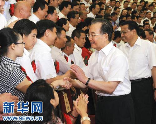 7月17日,國務院在北京人民大會堂隆重舉行全國就業創業工作表彰大會。中共中央政治局常委、國務院總理溫家寶出席會議并講話。這是會前,溫家寶等領導同志會見全體與會代表。 新華社記者 饒愛民 攝