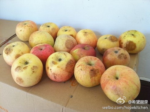 @希望廚房:安徽金寨納入了國家營養餐改善計劃,但是教育局招標企業統一配送。某所學校校長 拉著我們一定要看看配送的營養餐,這些蘋果是昨天剛送到的,準備周一發給學生。讓人震驚的是,這 些蘋果幾乎沒有一個是好的。校長幾乎恨得咬牙切齒:“這些人的良心都哪去了?!”