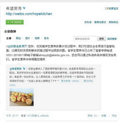 人民網訊 一條微博引起記者關注,昨日16時26分希望廚房發布微博,稱安徽金寨納入了國家營養餐改善計劃,但是教育局招標企業統一配送。某所學校配送的營養餐中的蘋果幾乎沒有一個是好的。