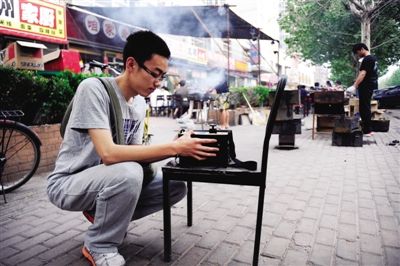 5月12日,豐臺鎮國寺北街附近一個燒烤攤,首都醫科大星星之綠環保協會成員趙中垚正測量PM2.5值。新京報記者 尹亞飛 攝