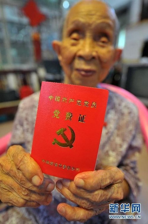 7月7日,王運梅老人展示自己的中國共產黨黨費證。近日,102歲的紅色娘子軍老戰士王運梅光榮加入了中國共產黨。由于老人出身貧寒,文化程度很低,不了解入黨的規定和程序,一直以為參加了革命便是入了黨,直到2010年一次偶然經歷才發現自己并不是共產黨員。老人讓自己的孫女代筆,向瓊海市陽江鎮嶺下村黨支部遞交了入黨申請書,2012年7月4日,王運梅老人正式成為中國共產黨預備黨員。新華社記者 郭程 攝