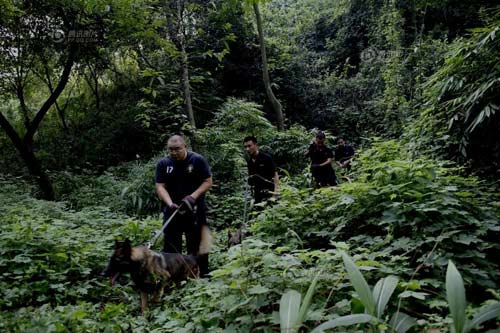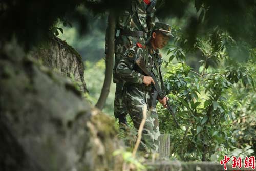 圖為武警官兵提著槍支搜尋犯罪嫌疑人蹤跡。